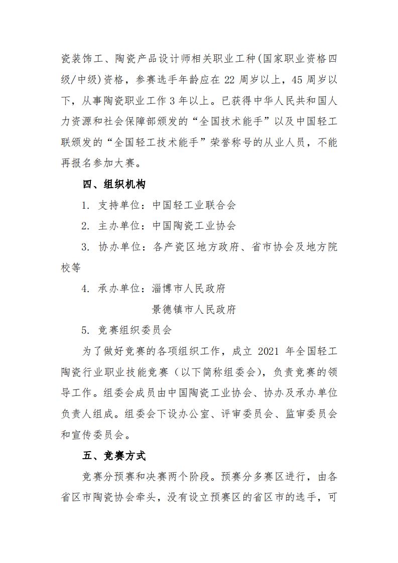 为进一步贯彻落实十九大和习近平总书记系列讲话精神,弘扬劳模精神和工匠精神,推动陶瓷行业高素质技能人才队伍建设,弥补国赛职业种类较少的不足,推动各产区制瓷技艺的提升和行业的高质量发展,经协会研究决定,特此举办2021年全国轻工陶瓷行业职业技能竞赛。现将有关事项通知如下: