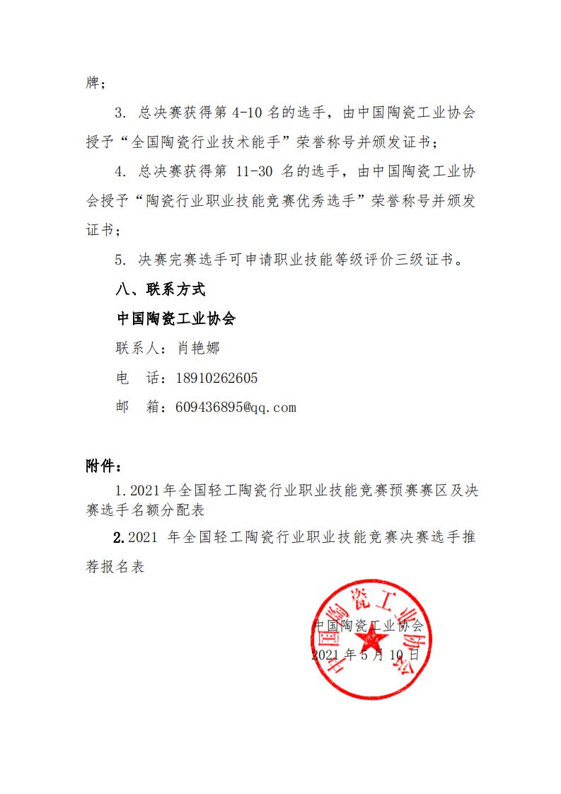 3. 总决赛获得第4-10名的选手,由中国陶瓷工业协会授予“全国陶瓷行业技术能手”荣誉称号颁发证书;