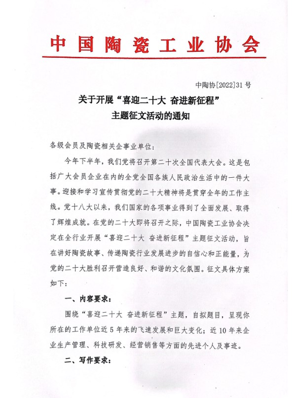 今年下半年,我们党将召开第二十次全国代表大会。这是包括广大会员企业在内的全党全国各族人民政治生活中的一件大事。迎接和学习宣传贯彻党的二十大精神将是贯穿全年的工作主线。党十八大以来,我们国家的各项事业得到了全面发展、取得了辉煌成就。在党的二十大即将召开之际,中国陶瓷工业协会决定在全行业开展“喜迎二十大 奋进新征程”主题征文活动,旨在讲好陶瓷故事、传递陶瓷行业发展进步的自信心和正能量,为党的二十大胜利召开营造良好、和谐的文化氛围。征文具体方案如下: