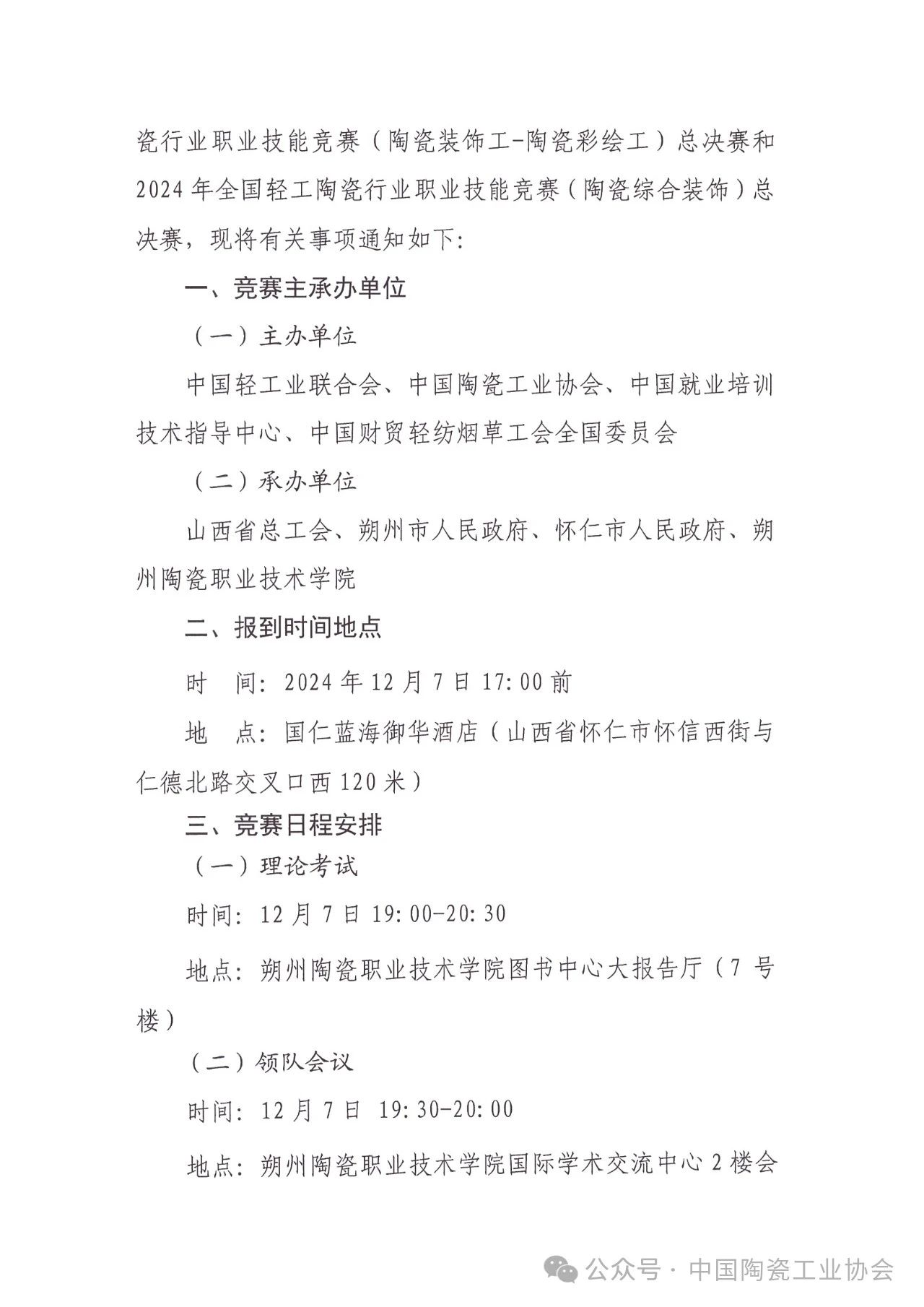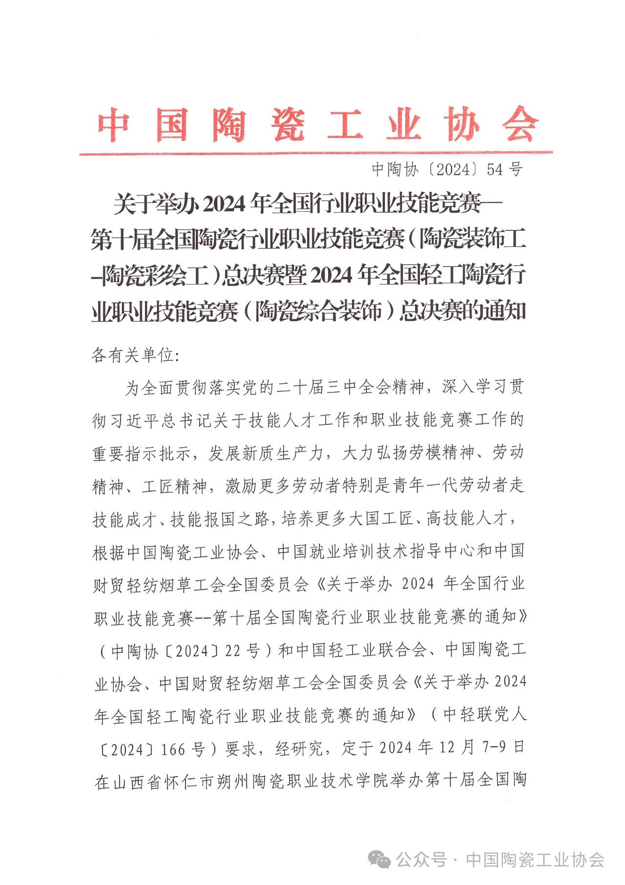 【通知】2024年第十届全国陶瓷行业职业技能竞赛(陶瓷彩绘工)总决赛暨全国轻工陶瓷行业职业技能竞赛(陶瓷综合装饰)总决赛的通知