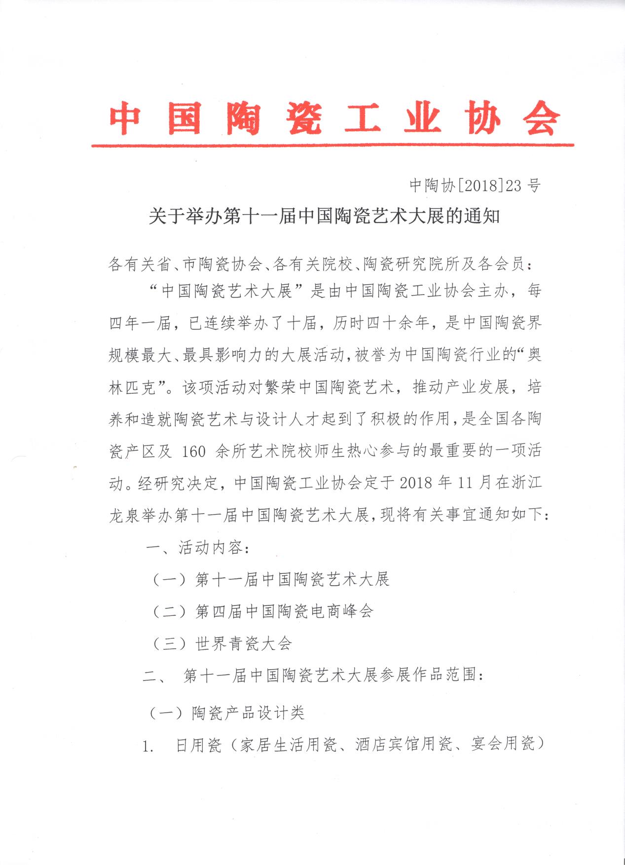 “中国陶瓷艺术大展”是由中国陶瓷工业协会主办,每四年一届,已连续举办了十届,历时四十余年,是中国陶瓷界规模较大、最具影响力的大展活动,被誉为中国陶瓷行业的“奥林匹克”。该项活动对繁荣中国陶瓷艺术,推动产业发展,培养和造就陶瓷艺术与设计人才起到了积极的作用,是全国各陶瓷产区及160余所艺术院校师生热心参与的最重要的一项活动。经研究决定,中国陶瓷工业协会定于2018年11月在浙江龙泉举办第十一届中国陶瓷艺术大展,现将有关事宜通知如下: