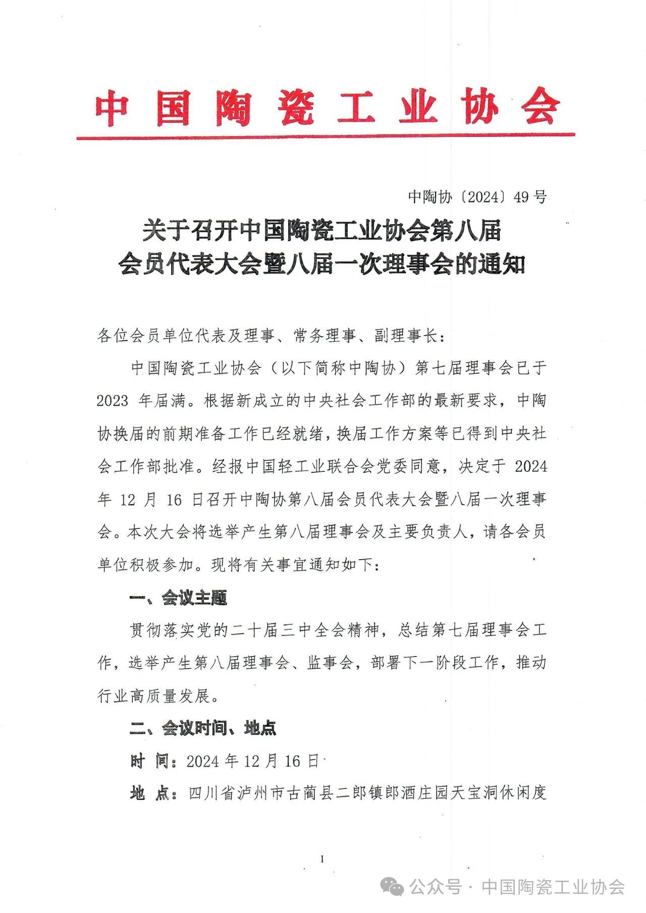 【通知】关于召开中国陶瓷工业协会第八届会员代表大会暨八届一次理事会的通知