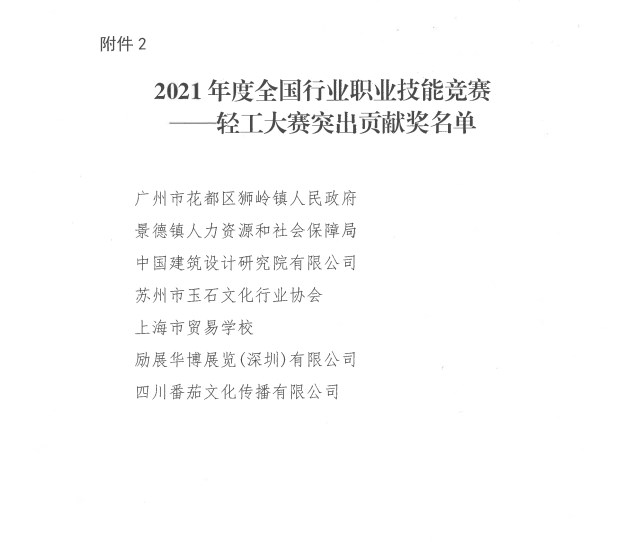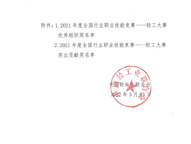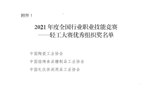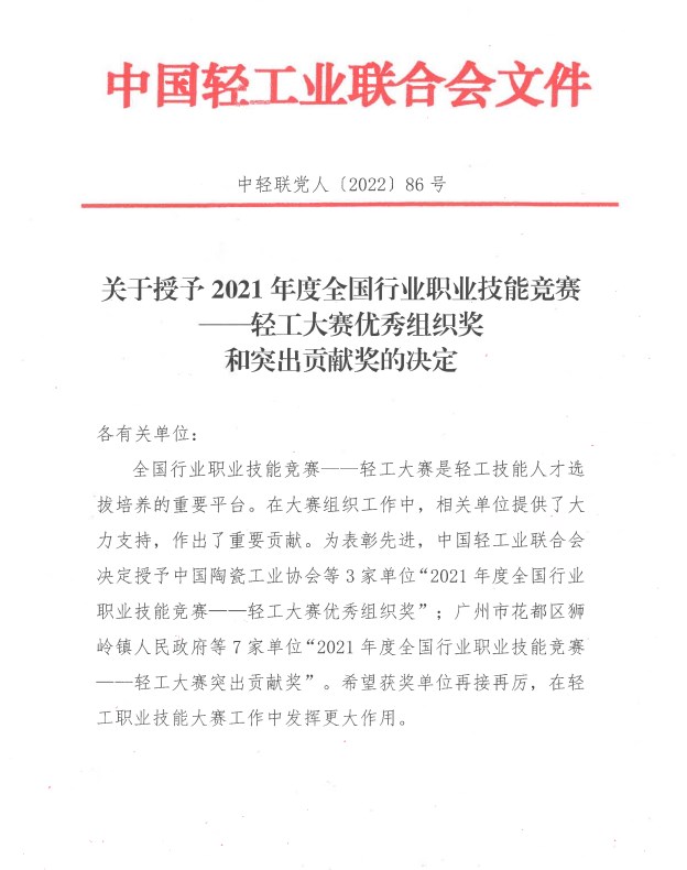 日前,因在2021年全国行业职业技能竞赛—第七届全国陶瓷行业职业技能竞赛总决赛组织工作中的突出表现,中国轻工联合会授予中国陶瓷工业协会“2021年度全国行业职业技能竞赛—轻工大赛优秀组织奖”。