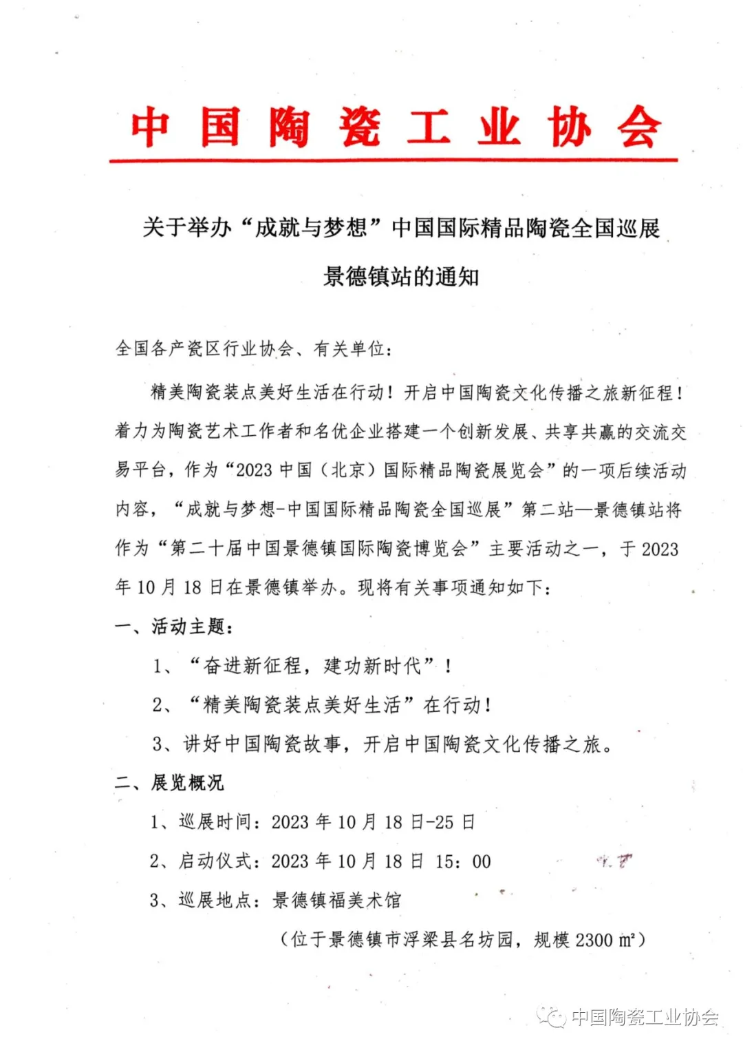 关于举办“成就与梦想”中国国际精品陶瓷全国巡展景德镇站的通知