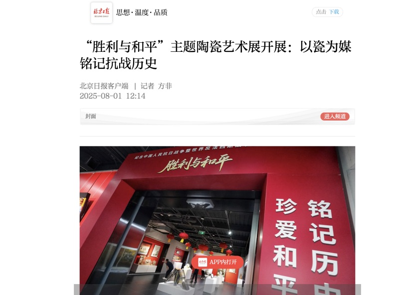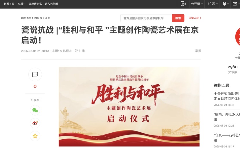 搜狐、网易、新浪、优酷、腾讯、爱奇艺等网络媒体:纷纷开辟专题页面,全方位呈现展览盛况。报道特别指出:“陶瓷艺术的脆弱与坚韧,恰如和平之珍贵与不易,每一件作品都在用独特的艺术语言诉说着那段可歌可泣的历史。