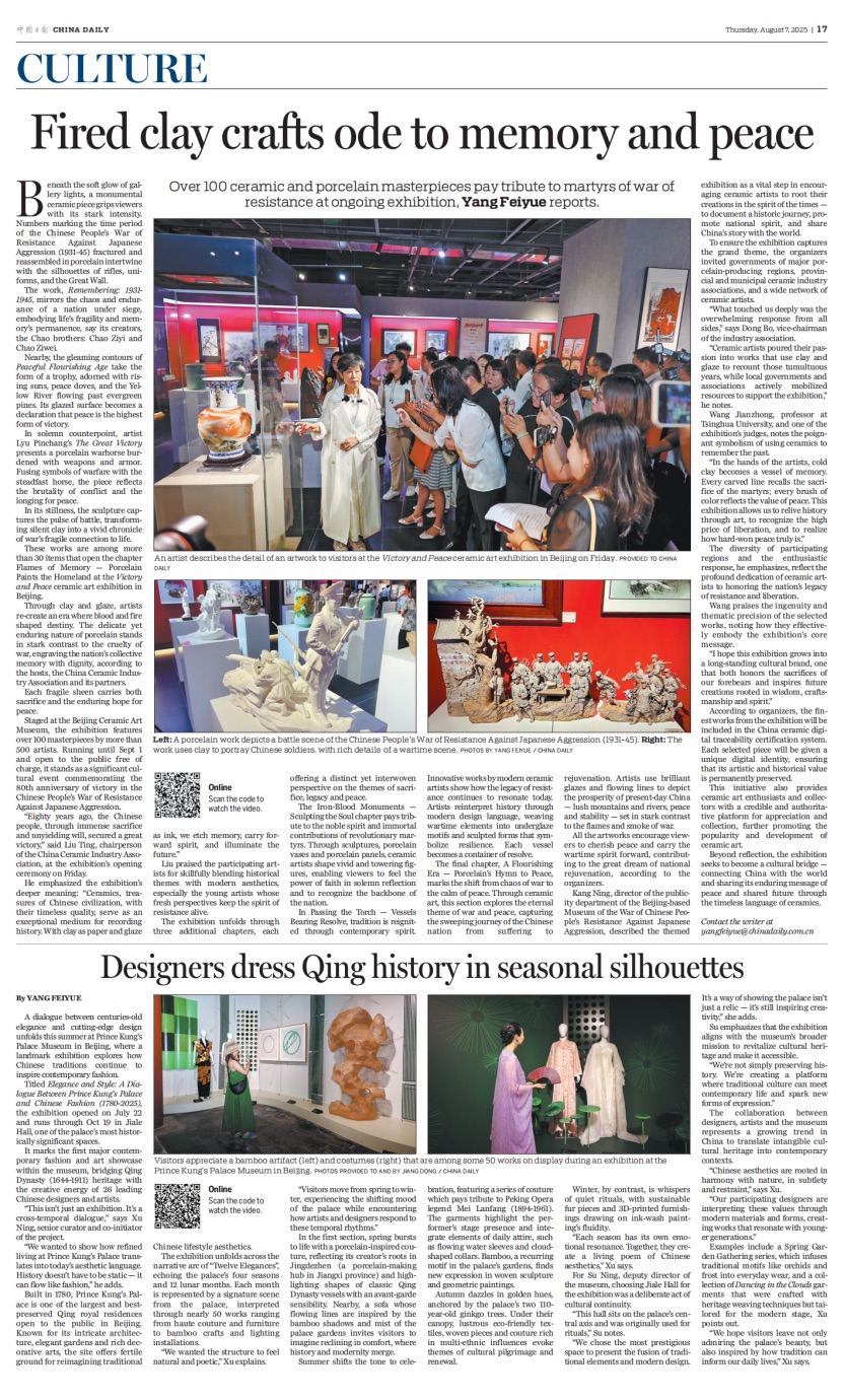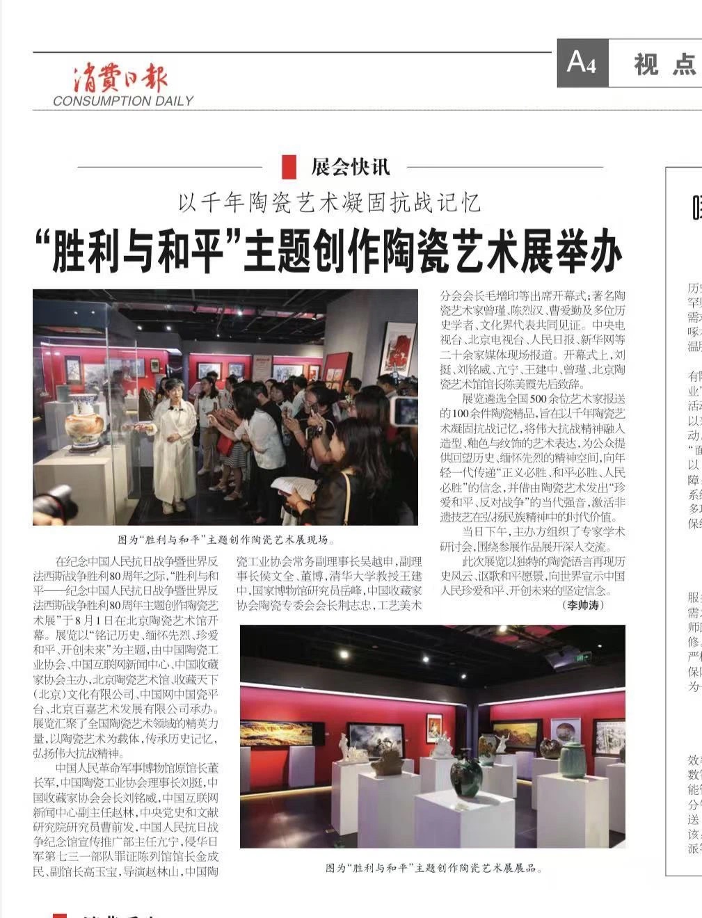 消费日报:聚焦展览借陶瓷语言再现历史风云,传递“正义必胜、和平必胜、人民必胜”的坚定信念,高度评价其在激活非遗技艺当代价值、向世界宣示中国人民珍爱和平、开创未来的决心方面的意义。